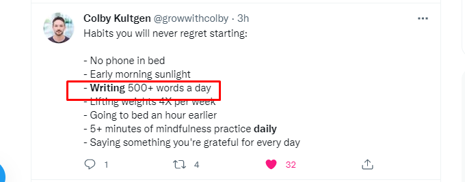 لكن تحدّي رديف معه جائزة، وهي إشتراك مجاني في أفضل مجتمع رقمي لتعليم الكتابة [في نظري]، وقيمته 60$، فإذا كان بإمكانك خوض التحدي لمعرفة نفسك واكتشاف حقيقة محبتك وهوسك بالكتابة، فلماذا لا يكون تحدّي رديف هو الخيار الأول.إذن أنت بحاجة للكتابة يوميًا، وهذا ليس كلامي أنا فقط، كل المواقع الأجنبية الخاصة بالكتابة لديها تحدّيات في الكتابة اليومية. وكلها مدفوعة تقريبًا مثل: موقع ship30for30 ديهم تحدي ثلاثين يوم، وهناك مواقع أخرى تفتح تحديات مشابهة بين فترة وفترة.