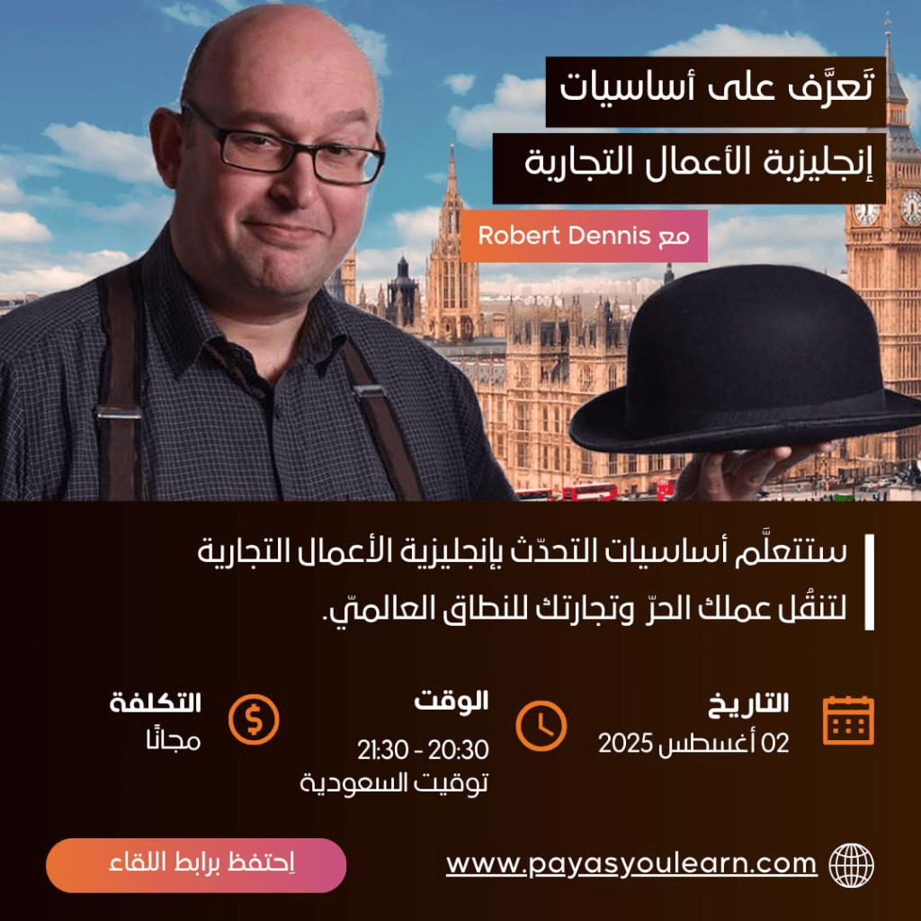 سيتشرّف مجتمع رديف باستضافة خبير اللغة الإنجليزية للأعمال روبرت دينيس (Robert Dennis) يوم السبت 2 أغسطس 2025. في التوقيت من 20:30 إلى 21:30 توقيت السعودية. إن شاء الله.