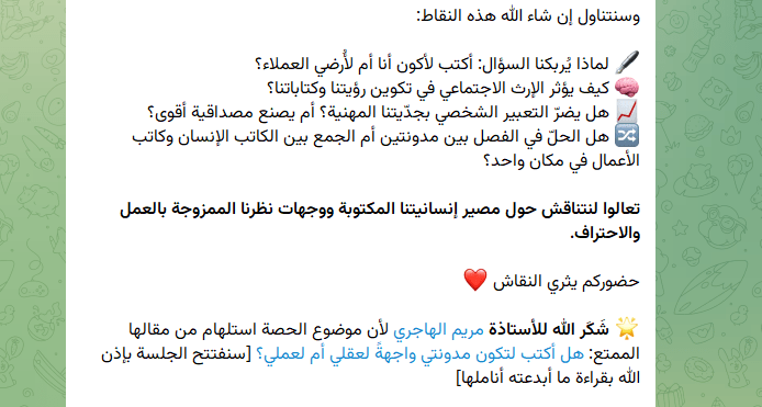 وإذا كنت في حيرة من أمرك في هذا الموضوع، وتخاف من أن تظهر شخصيتك في كتاباتك، ويقيّدك سؤال: هل أكتب عن شخصيتي وأبرز ذاتي؟ أم أكتب فقط في ما يطلبه القارئ؟ أو لديك أسئلة من هذا النحو، فأدعوك للاشتراك في رديف لأن هذا الموضوع يُناقش الآن في حصة رديف، والحصة مسجلة طبعًا. إذا قررت الاشتراك، أو اشتركت لاحقًا، فتواصل معي وسأدلك عليها.